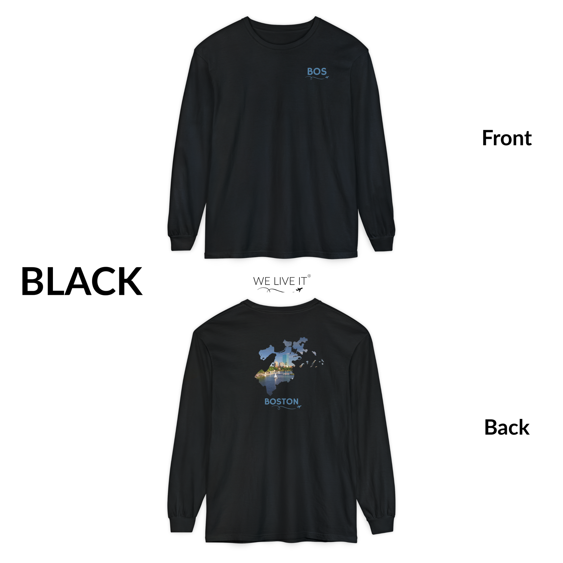 Celebrate Boston in a timeless, wearable way. This Boston long-sleeve T-shirt features a subtle BOS abbreviation on the front chest and a striking back design showcasing the city’s outline filled with a scenic photograph of the skyline. Inside the outline, the iconic 200 Clarendon Street, forever known to locals as the Hancock Tower, rises above the city, while a sailboat glides across the Charles River, capturing the coastal character and everyday beauty that define Boston.