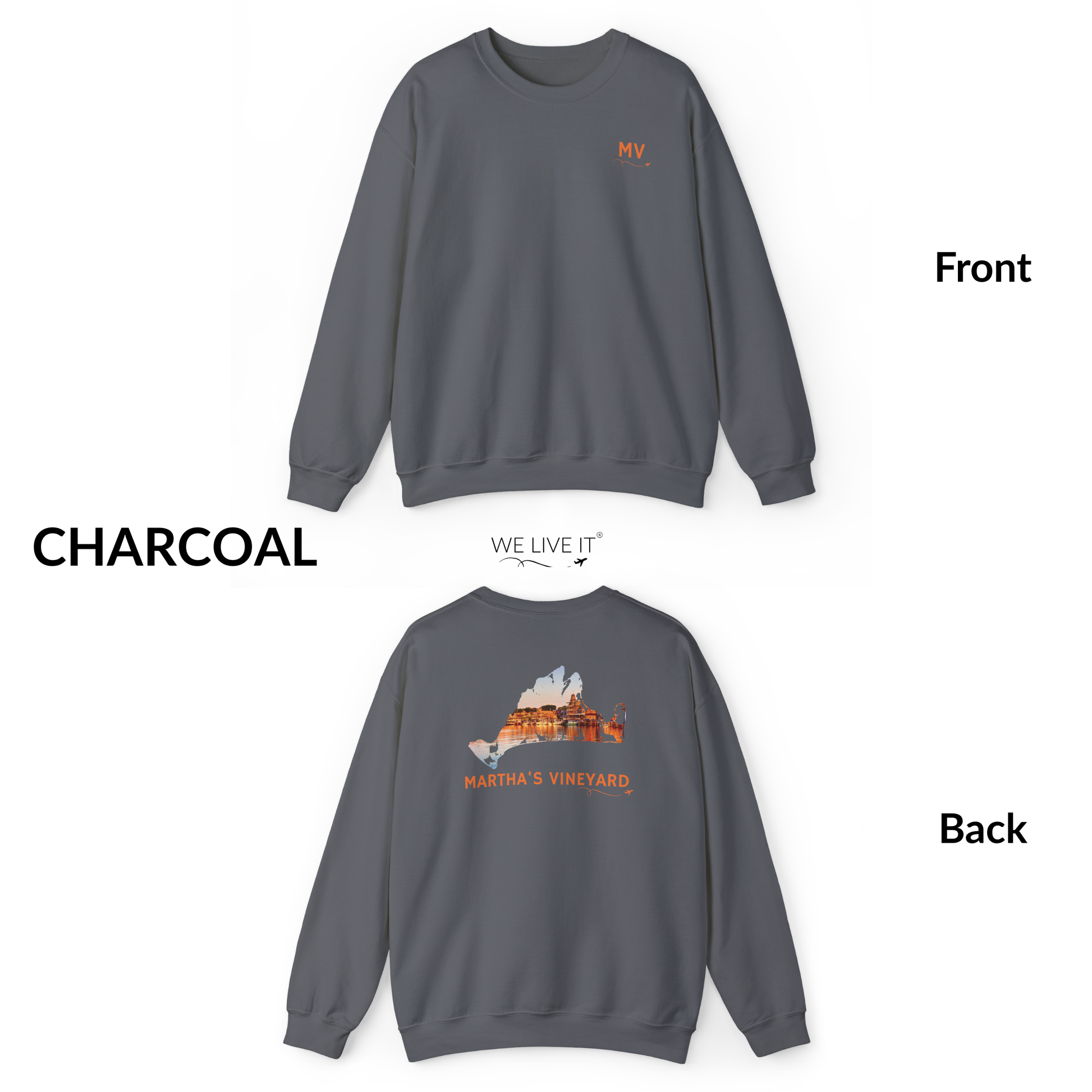 Martha’s Vineyard Crewneck Sweatshirt | MV Front & Oak Bluffs Harbor Sunset Back