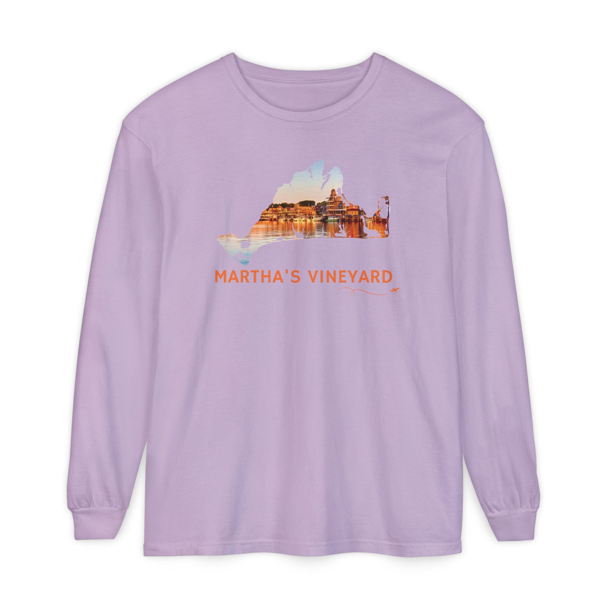 Carry the magic of a Vineyard evening wherever you go. This unisex long-sleeve shirt features a classic outline of Martha’s Vineyard filled with a fiery orange sunset overlooking Oak Bluffs and the harbor. Warm hues reflect off the water as the day fades, capturing the relaxed beauty and coastal charm that make the Vineyard unforgettable. It’s the perfect layer for cool seaside nights, fall walks, or everyday wear that keeps summer close.