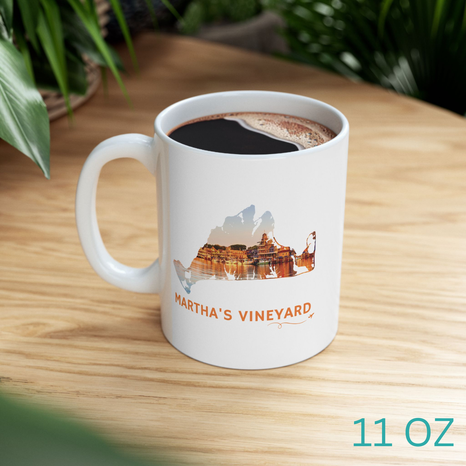 Bring the beauty of Martha’s Vineyard to your morning routine. This ceramic mug features the island’s iconic outline filled with a breathtaking photo of Oak Bluffs Harbor at sunset, capturing the tranquil glow of the waterfront and the calm coastal charm the Vineyard is known for. Perfect for your morning coffee, evening tea, or any moment that calls for a peaceful escape.